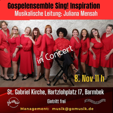Hierfür steht das Gospelensemble Sing! Inspiration, dass seit Jahren mit seinem Gesang gute Laune verbreitet. Ob im Michel oder beim Gospelfestival in Planten un Blomen.