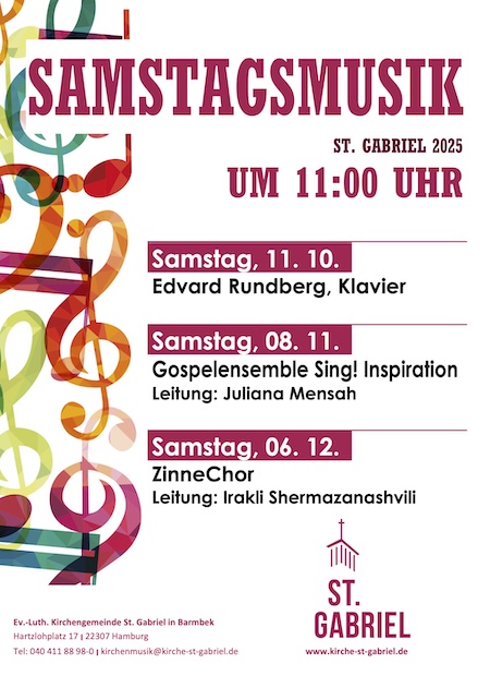 Die beliebte Konzertreihe „Samstagsmusik“ hier bei uns in St. Gabriel wird fortgesetzt und wir laden ganz herzlich zu diesen Konzerten ein!